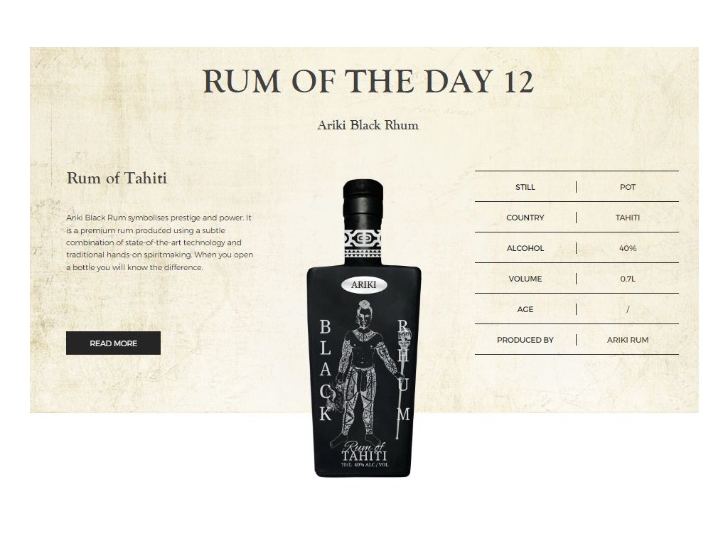 Ariki Rhum se vyrábí z cukrové třtiny pěstované na ostrovním ráji Taha’a – sesterském ostrově Tahiti, který sdílí lagunu Raiatea. Mezi 11 identifikovanými odrůdami cukrové třtiny je cukrová třtina Otahiti ušlechtilou odrůdou pocházející z Tahiti a od 60. let 18. století se vyváží do celého světa. Tato velká tropická cukrová třtina poskytuje sladkou šťávu, která se přeměňuje na prémiové produkty, jako je Ariki Rum. Výsledkem je rum, který je oceňován pro svou všestrannost: chutná a popíjí čistý a pomalu jako koňak, konzumuje se v koktejlech a používá se i při vaření.