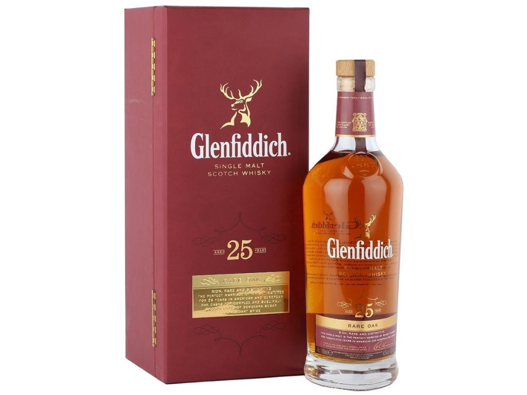 Glenfiddich 25 Year Old Whisky je pak dokonalým spojením dvou kontinentů. Velké sudy po španělské sherry se postaraly o plnou ovocnou chuť, menší soudky po americkém bourbonu přidaly tóny vanilky a špetky koření. Výsledkem je výjimečná jednosladová whisky, vyráběná v malých sériích. Vaše čichové buňky potěší nasládlé aroma dubového dřeva spolu se závanem limetkové marmelády a hříšného sušeného ovoce. V prvním doušku vás čeká jemně kořeněná chuť s kulatým vanilkovým tělem a tóny třtinového cukru a pražených mandlí. Příjemně dlouhý finiš si pak vychutnáte se špetkou kardamomu, skořice, muškátového oříšku a hřebíčku. Speciální uzávěr z dubového dřeva uchová veškeré aroma bezpečně uvnitř lahve. Tahle lahůdka tak na vás bude čekat stále v té nejlepší formě.
