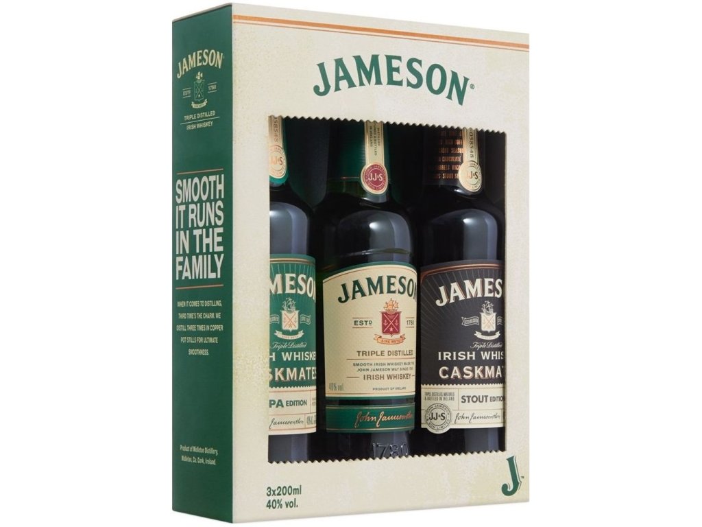 Jameson Caskmates Stout: Pot still a žitná whiskey. Zrání v sudech po bourbonu a španělské sherry. Finišováno v sudech po pivu stout.
