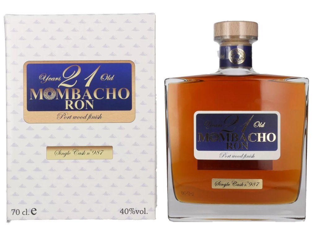 Mombacho 21YO Single Cask N°. 987 Port Wood Finish. Rum, který zraje minimálně 21 let v dubových sudech po bourbonu a následně dozrává v sudech po „portském“ – „Port Wood Finish“.