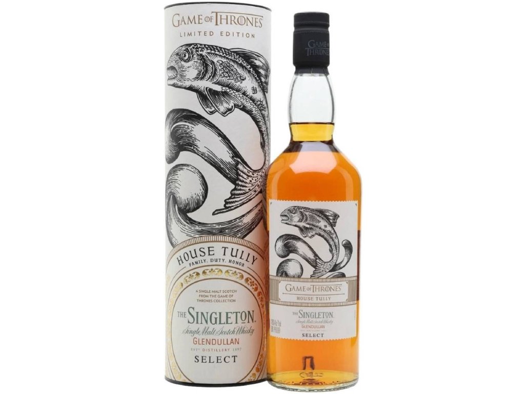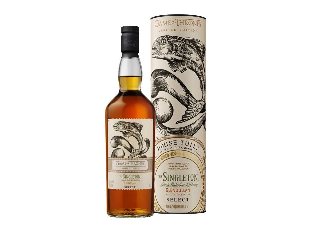 The Singleton Glendullan Game of Thrones kolekce - byla vyrobena ve Speyside v legendárním městě Dufftown, které produkuje více sladových whisky, než kterékoli město ve Skotsku. Glendullan se nachází na březích řeky Fiddich, a díky tomu zapadá do páru s Hradem rodu Tully, který leží u řeky Riverrun, která je známá z regionu Riverlands. Tato single malt whisky je zdobená skákajícími pstruhy - jenž je znamení rodu Tully.