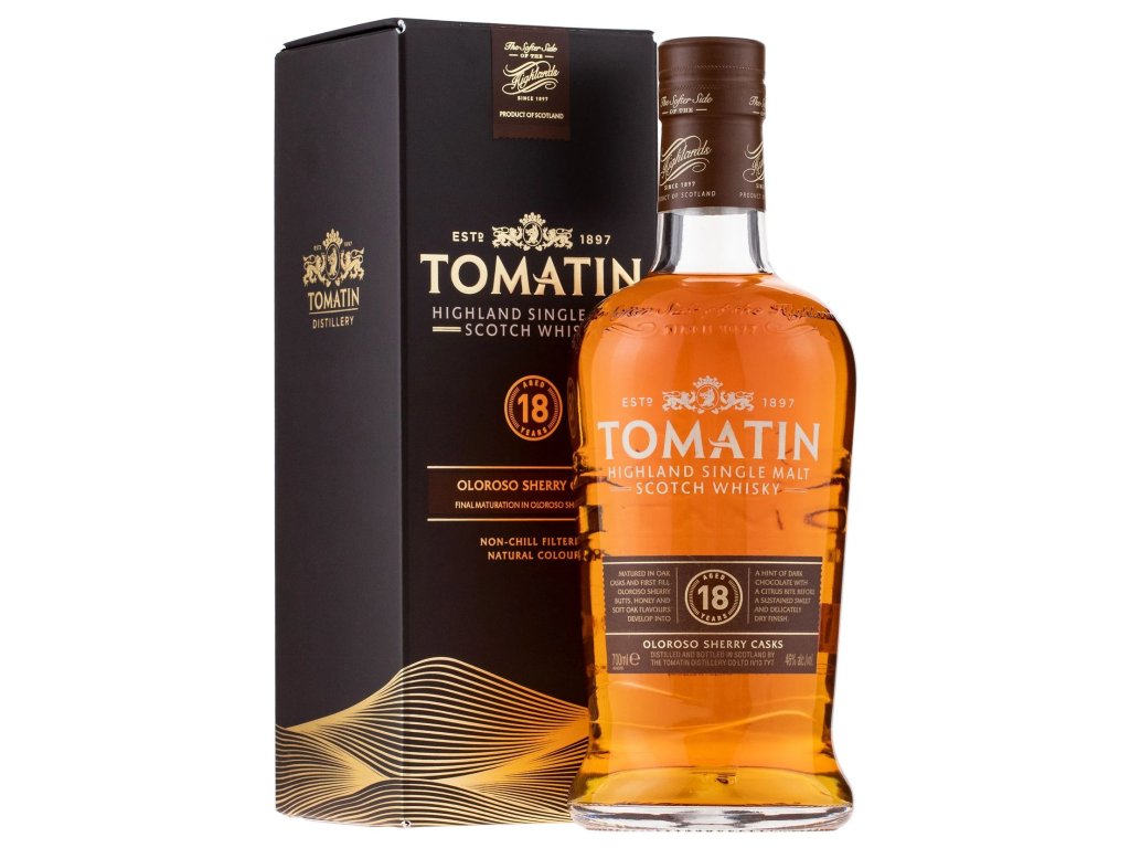 Tomatin je prémiová skotská jednosladová whisky zrozená v srdci skotské Vysočiny, nedaleko města Inverness. Palírna Tomatin byla oficiálně uvedena do provozu v roce 1897, máme však mnoho dobrých důvodů věřit, že whisky se zde načerno pálila mnohem dříve. Historie ilegálního pálení se v tomto kraji datuje až hluboko do 17-tého století. Samotný název Tomatin v gaelštině znamená „Kopec porostlý jalovcovými keři“. Jalovcové dřevo bylo velmi populární mezi ilegálními výrobci whisky, neboť při spalování prakticky nekouřilo. V areálu palírny pak dodnes stojí budova známá jako “The Old Laird’s House”, ve které si podle dostupných záznamů doplňovali svoje „flasks“ honáci dobytka. Dnes patří Tomatin k jedné z největších destilerií ve Skotsku, jako single malt whisky je však lahvována jen velmi malá část produkce. Při výrobě používá měkkou vodu z Alt-na-Frith, destilace probíhá samozřejmě v tradičních měděných kotlích. Whisky zraje převážně v sudech po bourbonu a po sherry.