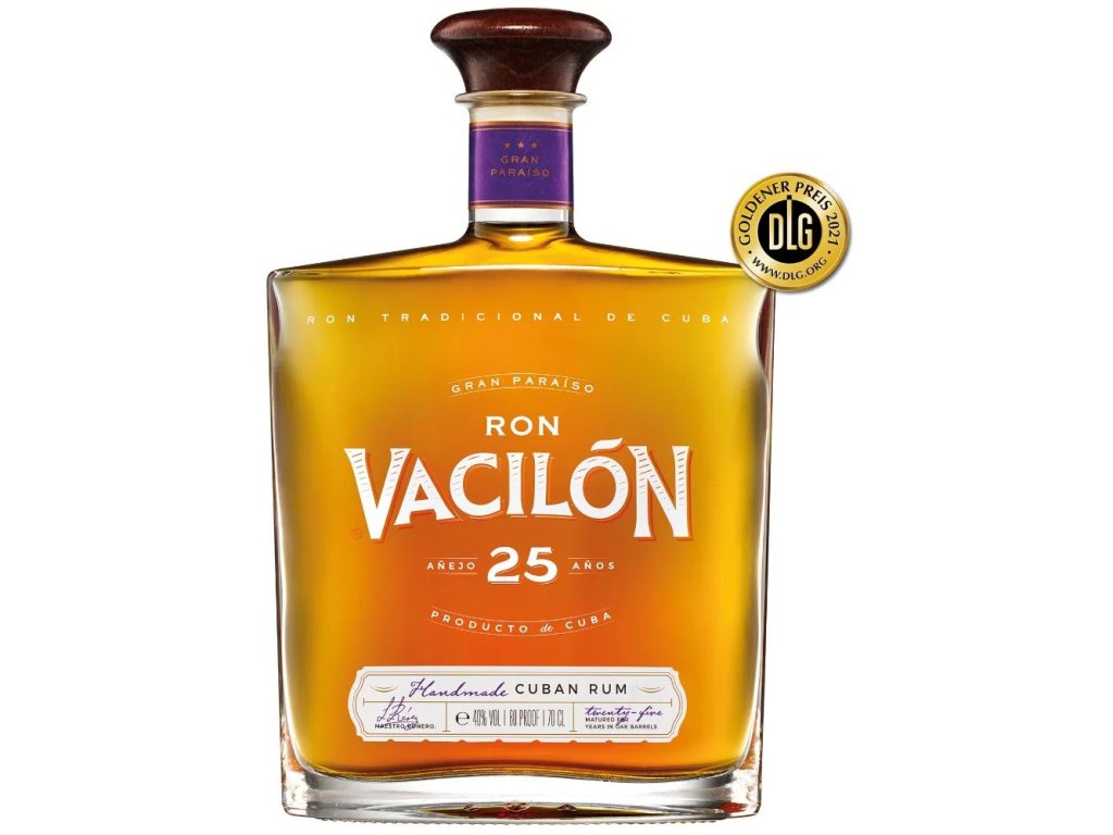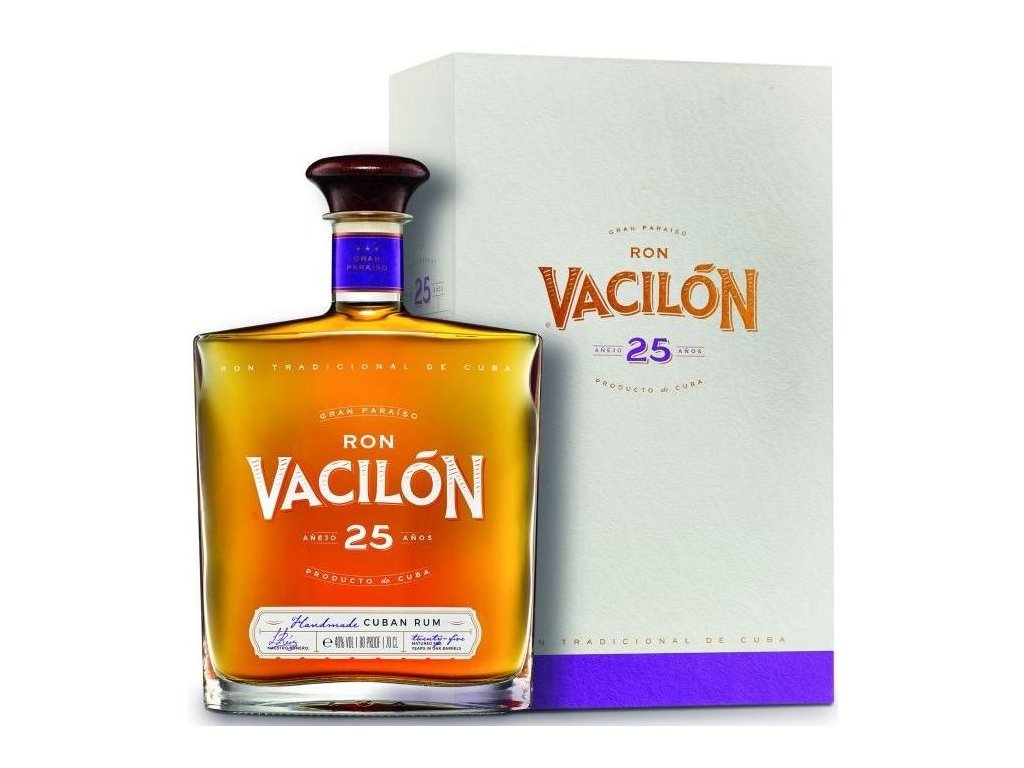 Aroma svěžích ovocných tónů hroznů a mirabelek s lehkým dotekem květin, kokosu a maracuji. Výjimečně suchý a mnohovrstevnatý rum s jemnými tóny vlašských ořechů. Vybroušená kompozice dosahující fantastické rovnováhy chutí exotického koření, svěžích citrusů a praženého karamele. Ron Vacilón je tradiční značka kubánského rumu. Stejně jako v roce 1956, tak i dnes se vyrábí ručně z té nejlepší kubánské cukrové třtiny a bez dobarvování karamelem. Ron Vacilón 25 Aňos zraje dvacet pět let v dubových sudech po bourbonu.